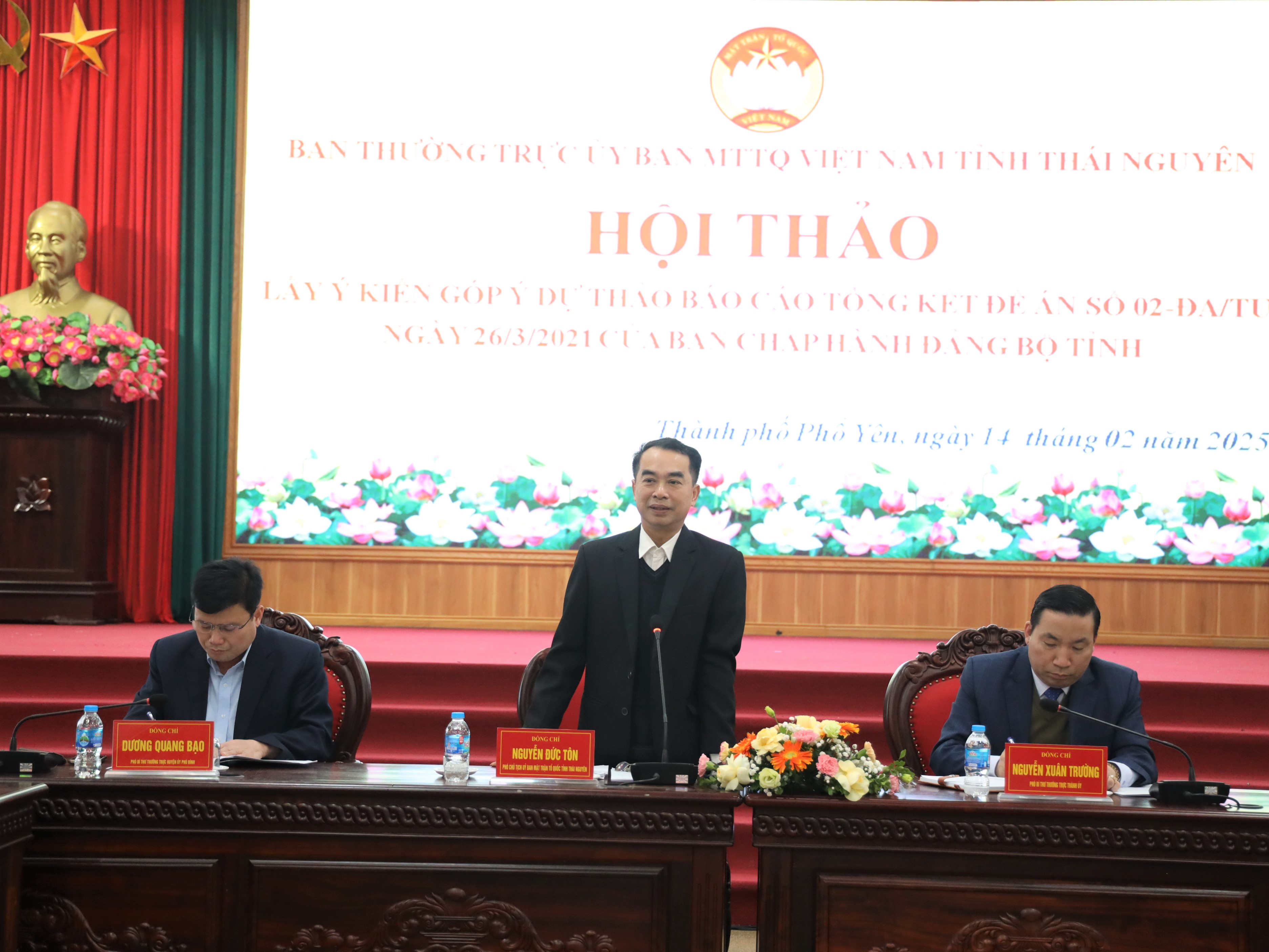 Trong các ngày 12, 14/02/2025, Ban Thường trực Ủy ban MTTQ tỉnh tổ chức Hội thảo lấy ý kiến góp ý vào dự thảo Báo cáo tổng kết thực hiện Đề án số 02-ĐA/TU ngày 26/3/2021 của Ban Chấp hành Đảng bộ tỉnh Thái Nguyên về “Phát huy vai trò giám sát, phản biện xã hội góp phần tham gia xây dựng Đảng, chính quyền của MTTQ Việt Nam và các đoàn thể chính trị - xã hội, giai đoạn 2021-2025”