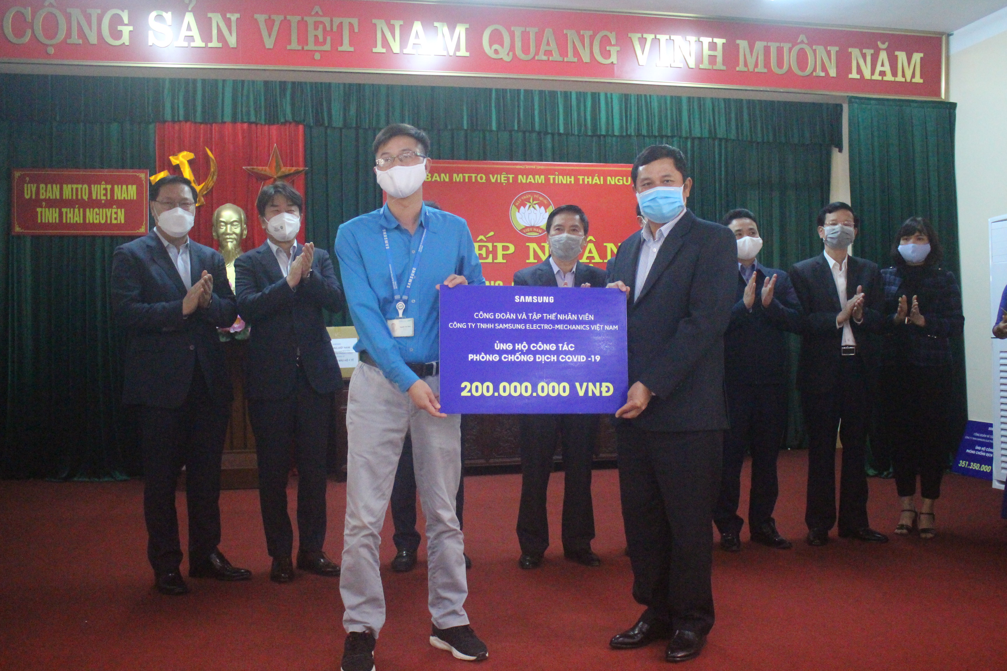 Chiều 15-4, ông Choi Joo Ho, Tổng Giám đốc Tổ hợp Sam Sung Việt Nam cùng đại diện Sam Sung điện tử Việt Nam- Thái Nguyên, Ban Chấp hành Công đoàn các công ty của tập đoàn đang hoạt động trên địa bàn tỉnh đã trao tặng và ủng hộ công tacd, phòng chống dịch COVID-19 tại trụ sở Uỷ ban MTTQ tỉnh Thái Nguyên. Tiếp và đón nhận sự hỗ trợ có các cồng đồng chí: Vũ Hồng Bắc, Phó Bí thư Tỉnh ủy, Chủ tịch UBND tỉnh, Trưởng Ban Chỉ đạo phòng, chống dịch COVID-19 của tỉnh; Phạm Thái Hanh, Ủy viên Ban Thường vụ, Chủ tịch Ủy ban MTTQ tỉnh.