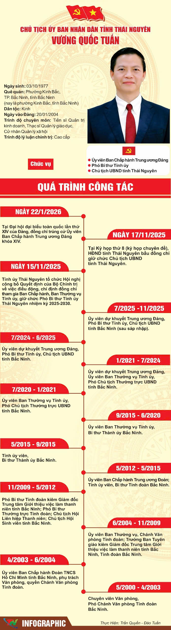 Ngày 22/01/2026, tại Đại hội đại biểu toàn quốc lần thứ XIV của Đảng, đồng chí Phó Bí thư Tỉnh ủy, Chủ tịch UBND tỉnh Thái Nguyên Vương Quốc Tuấn trúng cử Ủy viên Ban Chấp hành Trung ương Đảng khóa XIV.