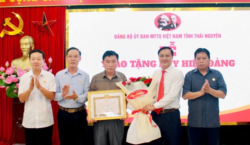 Đồng chí Vũ Duy Hoàng, Ủy viên BTV TU, Phó Bí Thư Đảng ủy, PCT Thường trực Ủy ban MTTQ Việt Nam tỉnh trao Huy hiệu 40 năm tuổi Đảng